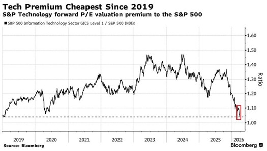 That premium has now been fully unwound. Software stocks fell approximately 25% in Q1 2026, and technology as a whole has reverted to 2019-era valuations. At the current pace, the sector is on track to trade at a discount to the S&P 500 for the first time since 2017.
